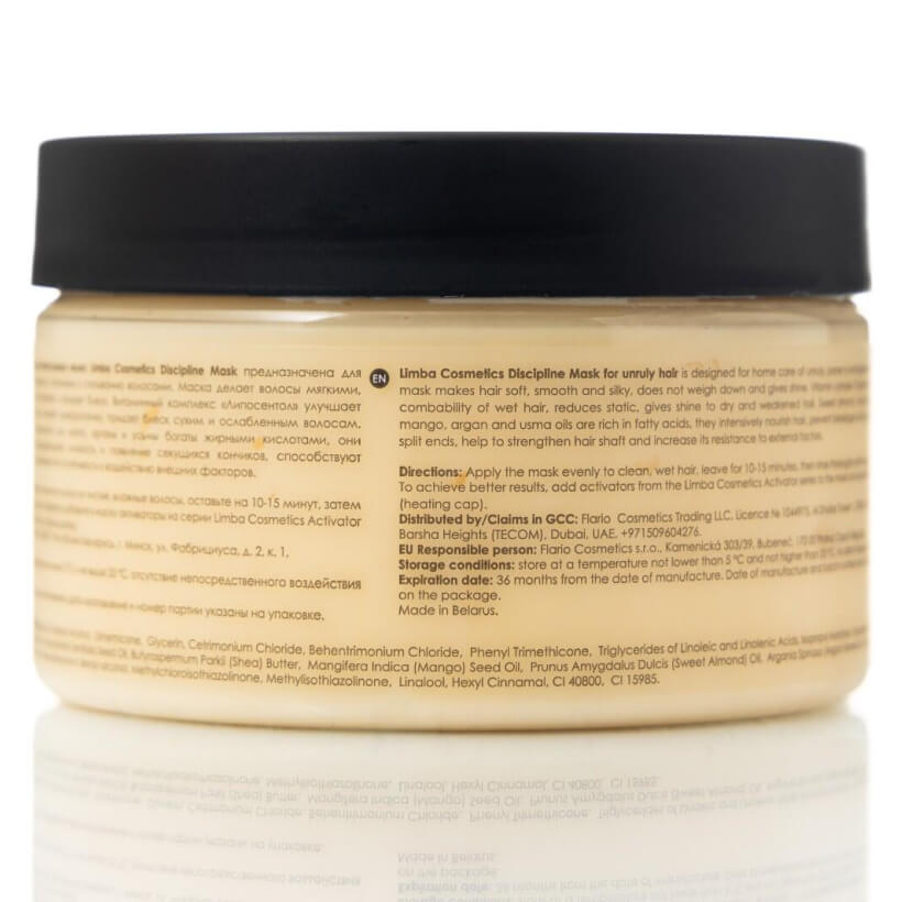 Дисциплинирующая маска Limba Cosmetics Discipline Mask предназначена для домашнего ухода за непослушными, склонными к спутыванию волосами. Маска делает волосы мягкими, гладкими и шелковистыми, не утяжеляет и придает блеск. Витаминный комплекс «Липосентол» улучшает расчесываемость мокрых волос, снижает электростатику, придает блеск сухим и ослабленным волосам. Масла сладкого миндаля, макадамии, ши, манго, арганы и усьмы богаты жирными кислотами, они интенсивно питают волосы, предотвращают ломкость и появление секущихся кончиков, способствуют укреплению стрежня волоса и повышают его устойчивость к воздействию внешних факторов.